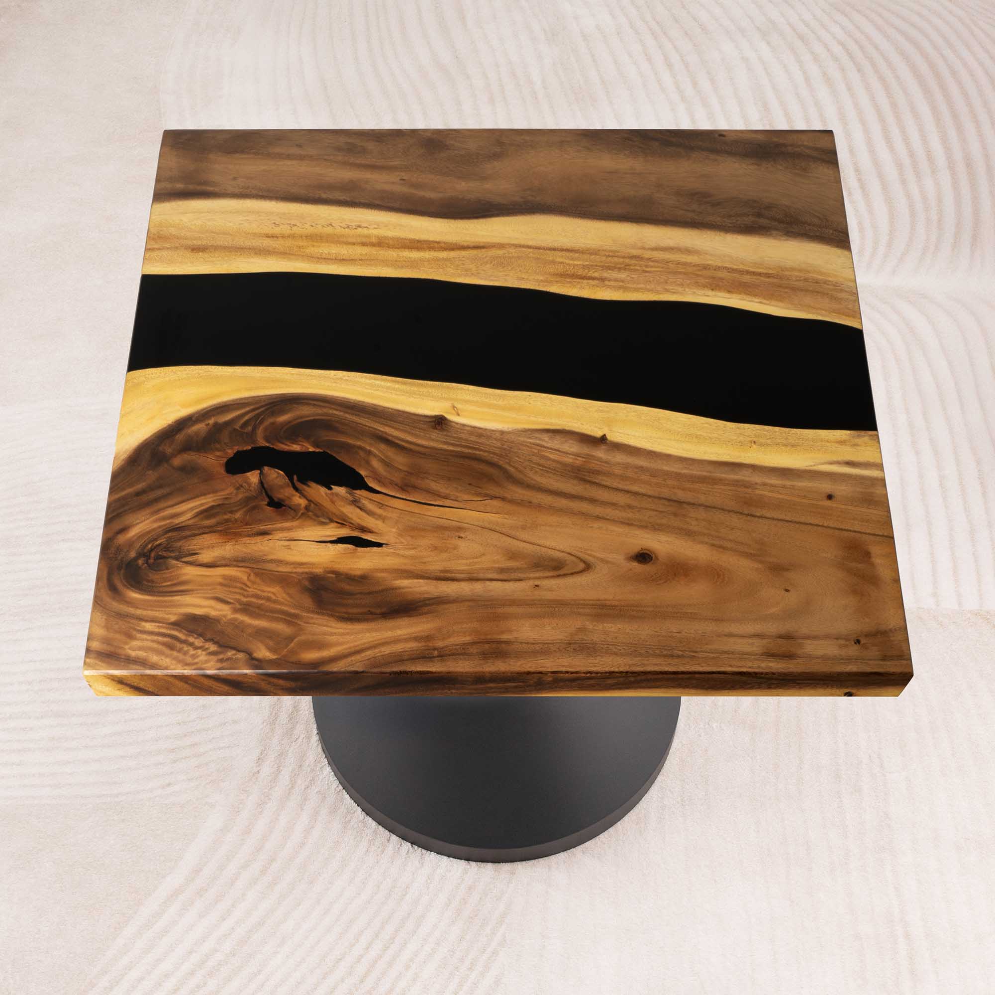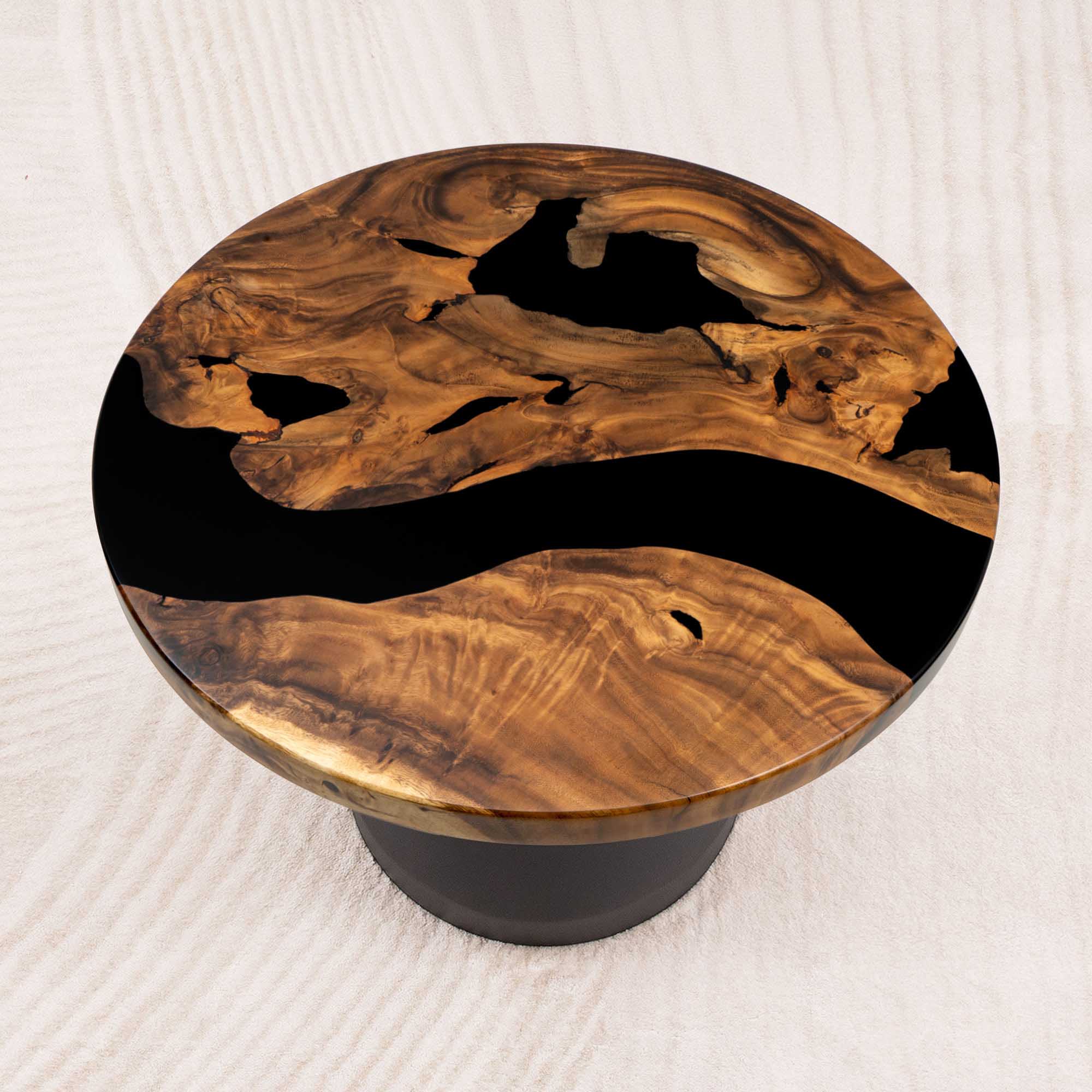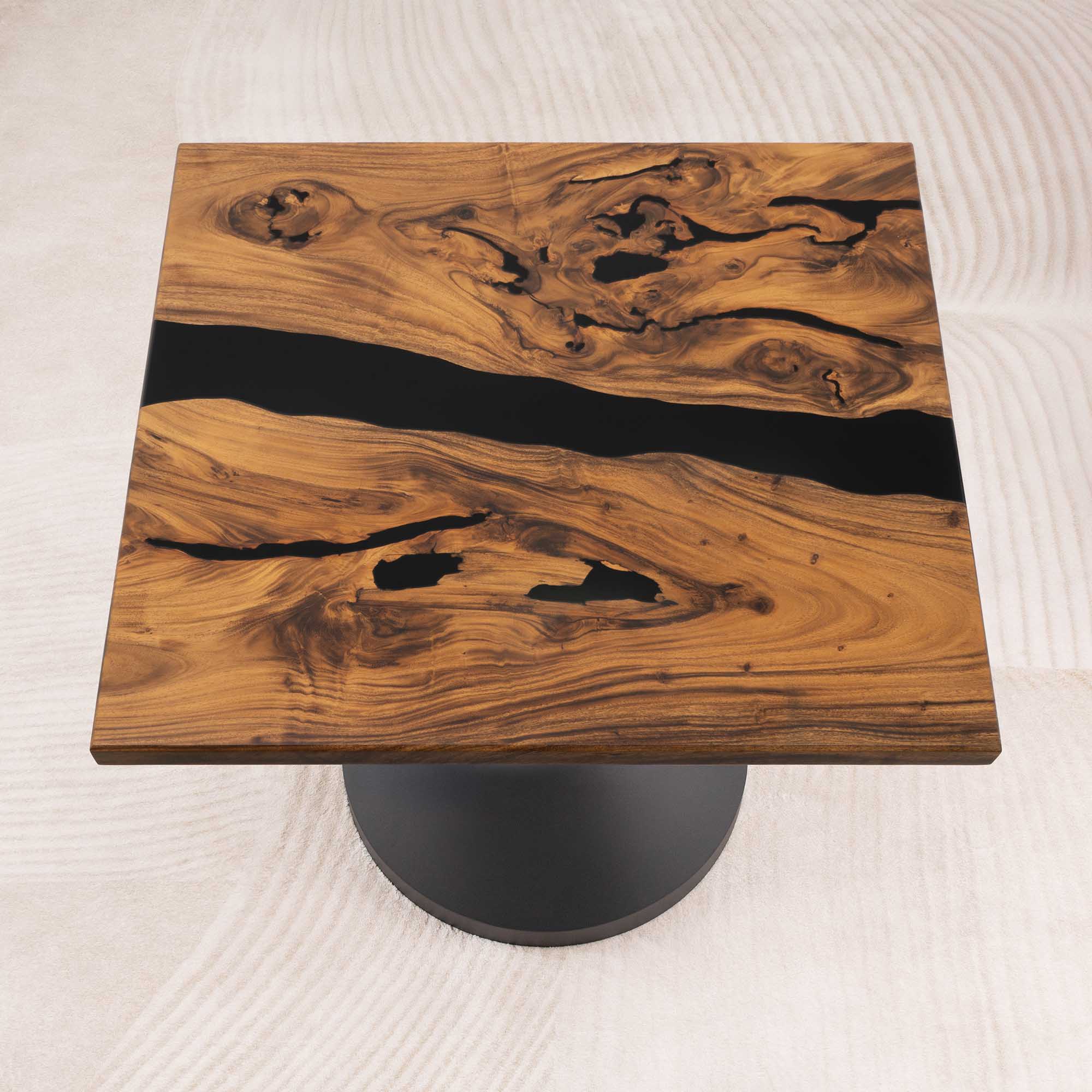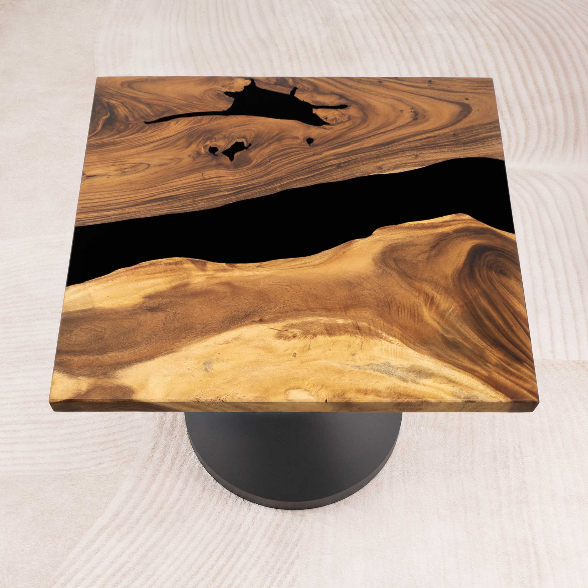Whether you're browsing our collection of unique epoxy tables for a coffee table, dining table, or end table, our custom epoxy resin creations can meet all your needs. Each of our epoxy tables is a unique work of art, thanks to the natural variations in the selected wood pieces. These epoxy resin tables can be made in various dimensions to match your space and are supported by a high-quality metal base, ensuring superior stability for years.