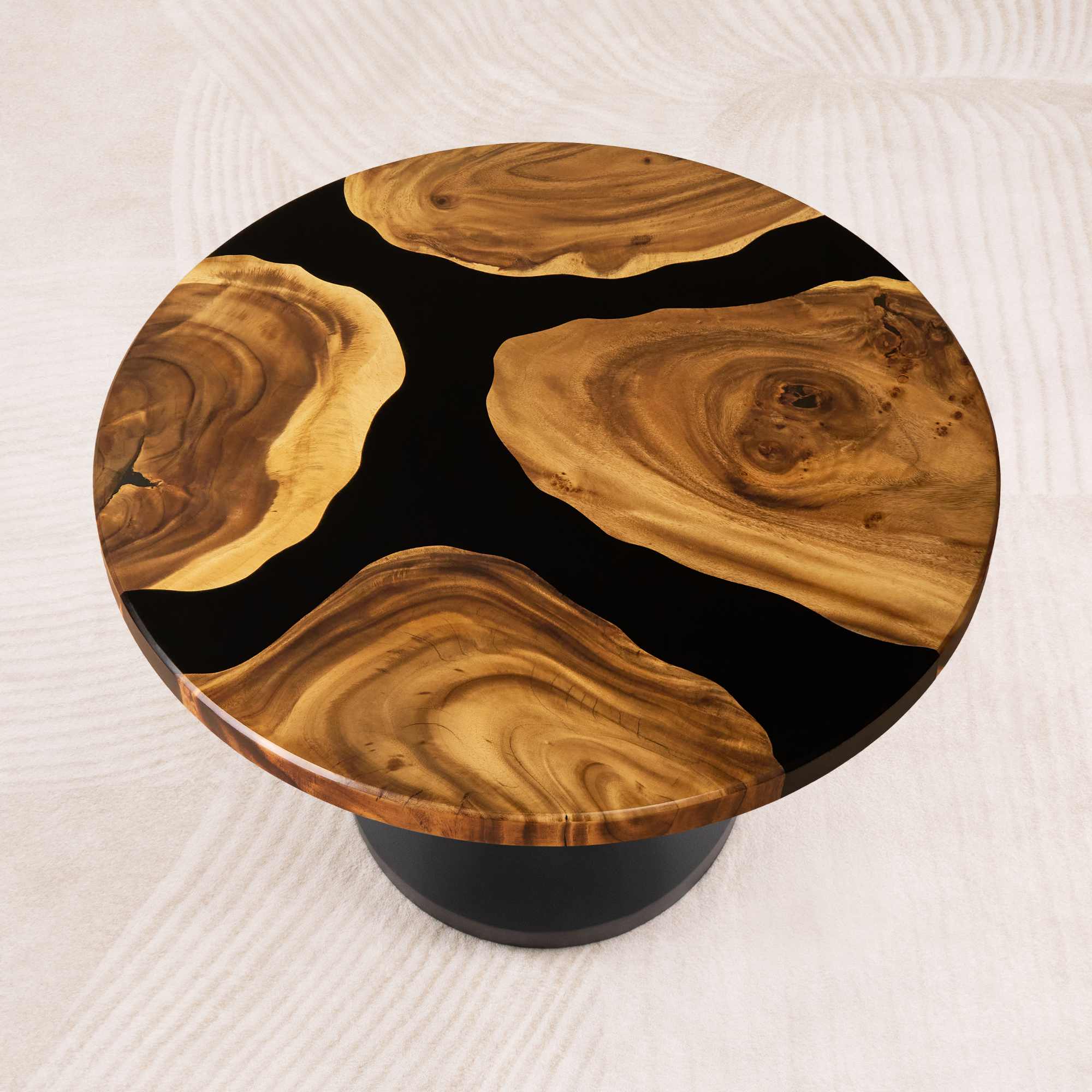 This round epoxy coffee table 35 inches is a unique piece of art, crafted from premium wood. The wood's natural grain showcases unique swirls and textures, perfectly contrasting with the modern black metal base, creating a timeless addition to any living space.